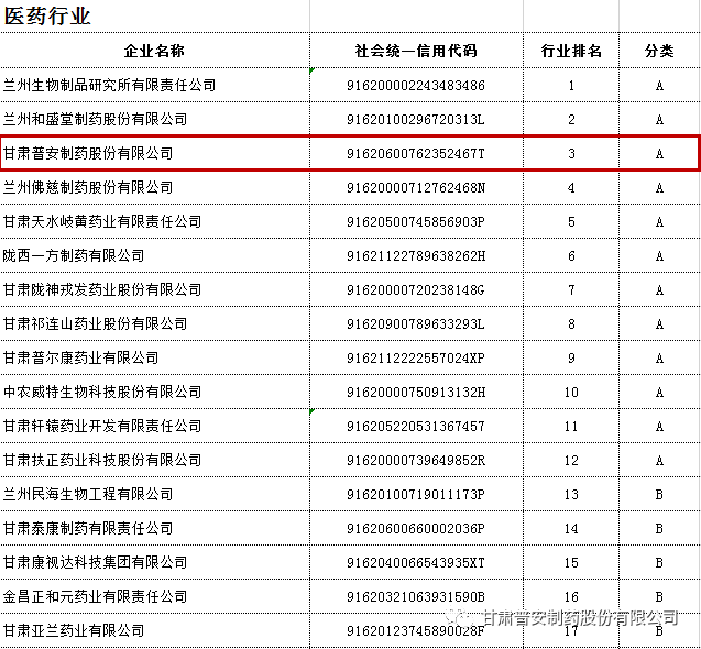 1月7日,根據(jù)甘肅省工業(yè)和信息化廳發(fā)布的“關(guān)于全省規(guī)模以上工業(yè)企業(yè)高質(zhì)量發(fā)展分類評價結(jié)果”的公示,普安股份被評為全省規(guī)模以上工業(yè)企業(yè)高質(zhì)量發(fā)展A類(優(yōu)先發(fā)展類)企業(yè),位列醫(yī)藥行業(yè)前三。此次分類評價工作經(jīng)專業(yè)第三方評價機構(gòu)評審,分類評價報告和評價結(jié)果經(jīng)部門聯(lián)席會議審定,最終確定企業(yè)分類評價結(jié)果。普安股份將依據(jù) “資源要素配置差別化政策”對A類企業(yè)的規(guī)定,加強與相關(guān)部門和單位對接,爭取獲得相關(guān)政策支持。