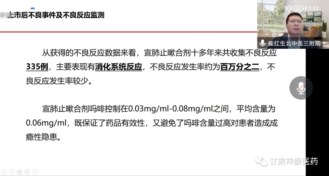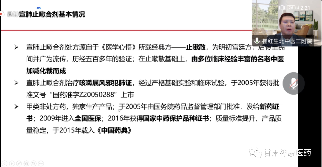 會上,由北京中醫(yī)藥大學(xué)第三附屬醫(yī)院崔紅生教授對宣肺止嗽合劑處方來源、獲獎專利、安全性等做了詳細的介紹。