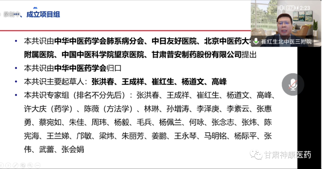 2022年10月21日下午,由中華中醫(yī)藥學(xué)會主辦,甘肅省普安制藥股份有限公司、北京康眾時代承辦的《宣肺止嗽合劑治療咳嗽臨床應(yīng)用專家共識》結(jié)題答辯會于線上舉行。中華中醫(yī)藥學(xué)會標(biāo)準(zhǔn)化辦公室負責(zé)人蘇祥飛主任,北京中醫(yī)藥大學(xué)第三附屬醫(yī)院王成祥院長、北京中醫(yī)藥大學(xué)第三附屬醫(yī)院崔紅生教授、中日友好醫(yī)院楊道文教授、河南中醫(yī)大學(xué)第一附屬醫(yī)院劉向哲教授等專家學(xué)者出席會議,會議由蘇祥飛主任主持。