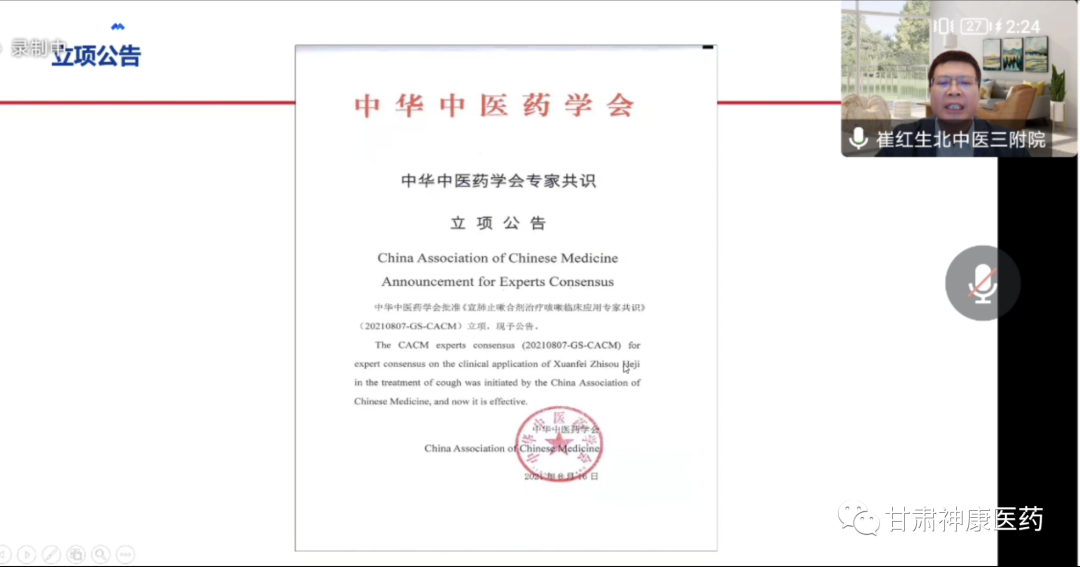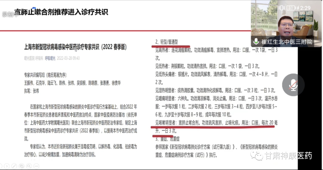 最后,崔教授對宣肺止嗽合劑在新冠肺炎疫情防控中展示出了獨特的治療價值和國藥魅力做了介紹,宣肺止嗽合劑在2022年3月,分別被列入《上海市新型冠狀病毒感染中醫(yī)藥診療專家共識》(2022年春季版)與《甘肅省新型冠狀病毒肺炎中醫(yī)藥防治方案(第四版)》。并于2022年5月,在上海中醫(yī)藥大學(xué)附屬曙光醫(yī)院開展了宣肺止嗽合劑治療新型冠狀病毒肺炎真實世界的相關(guān)研究,為后期循證證據(jù)搭建提供研究思路。