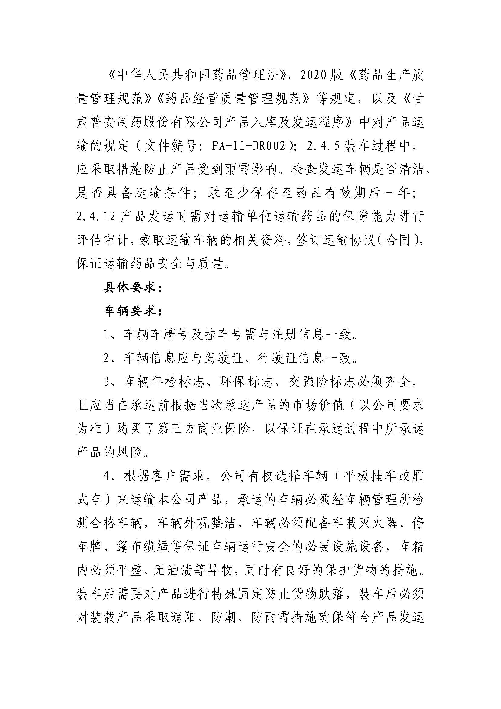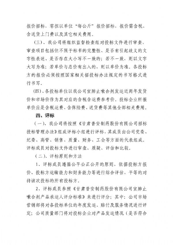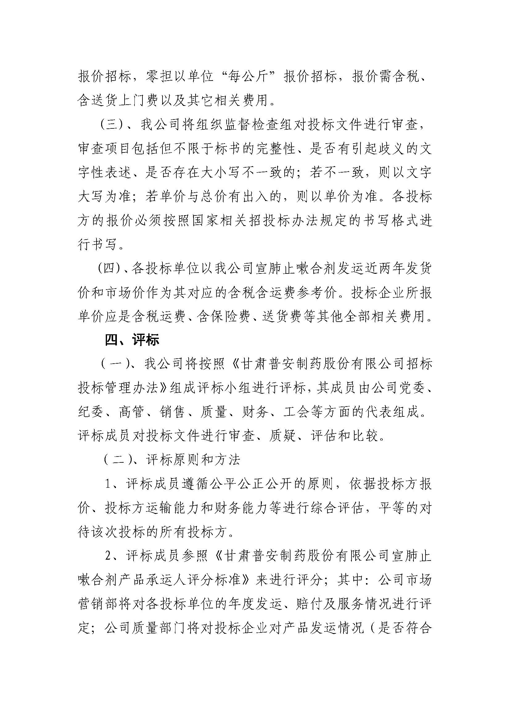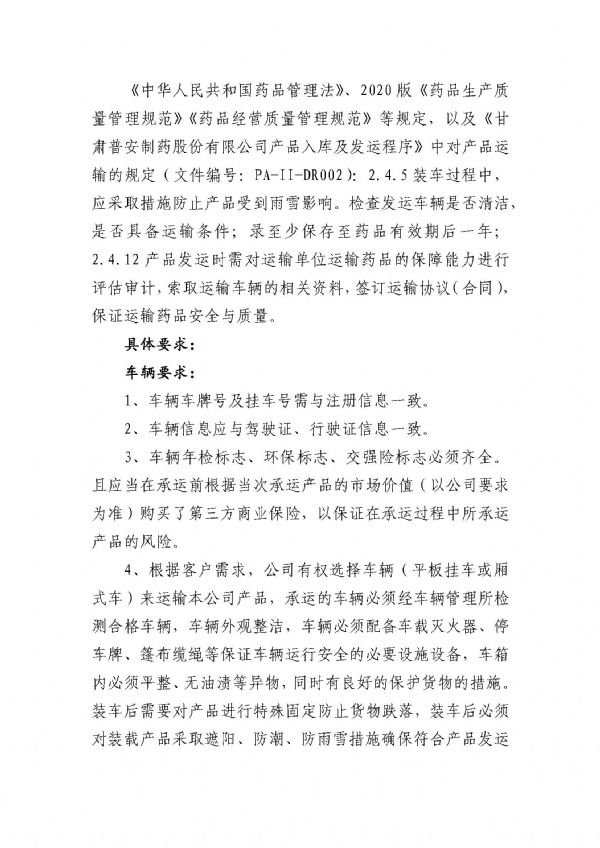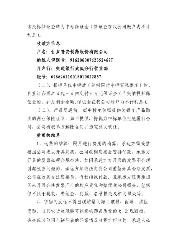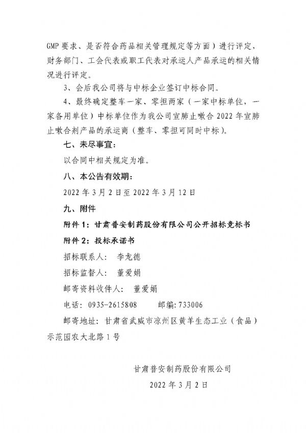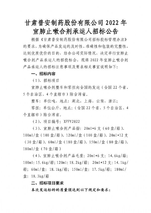 甘肅普安制藥股份有限公司宣肺止嗽合劑2022年承運(yùn)人招標(biāo)公告