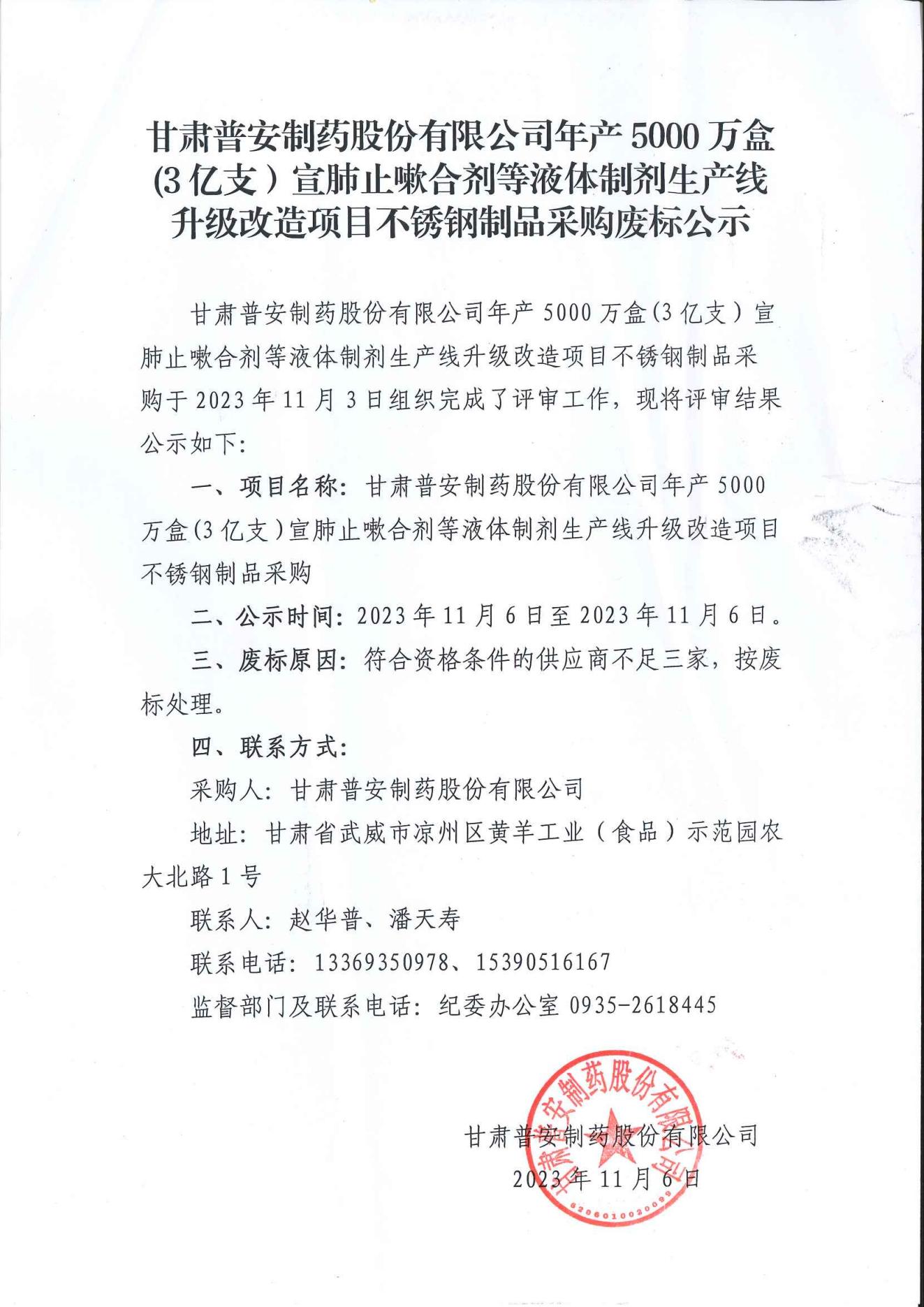 甘肅普安制藥股份有限公司年產(chǎn)5000萬盒(3億支)宣肺止嗽合劑等液體制劑生產(chǎn)線升級改造項(xiàng)目不銹鋼制品采購廢標(biāo)公示