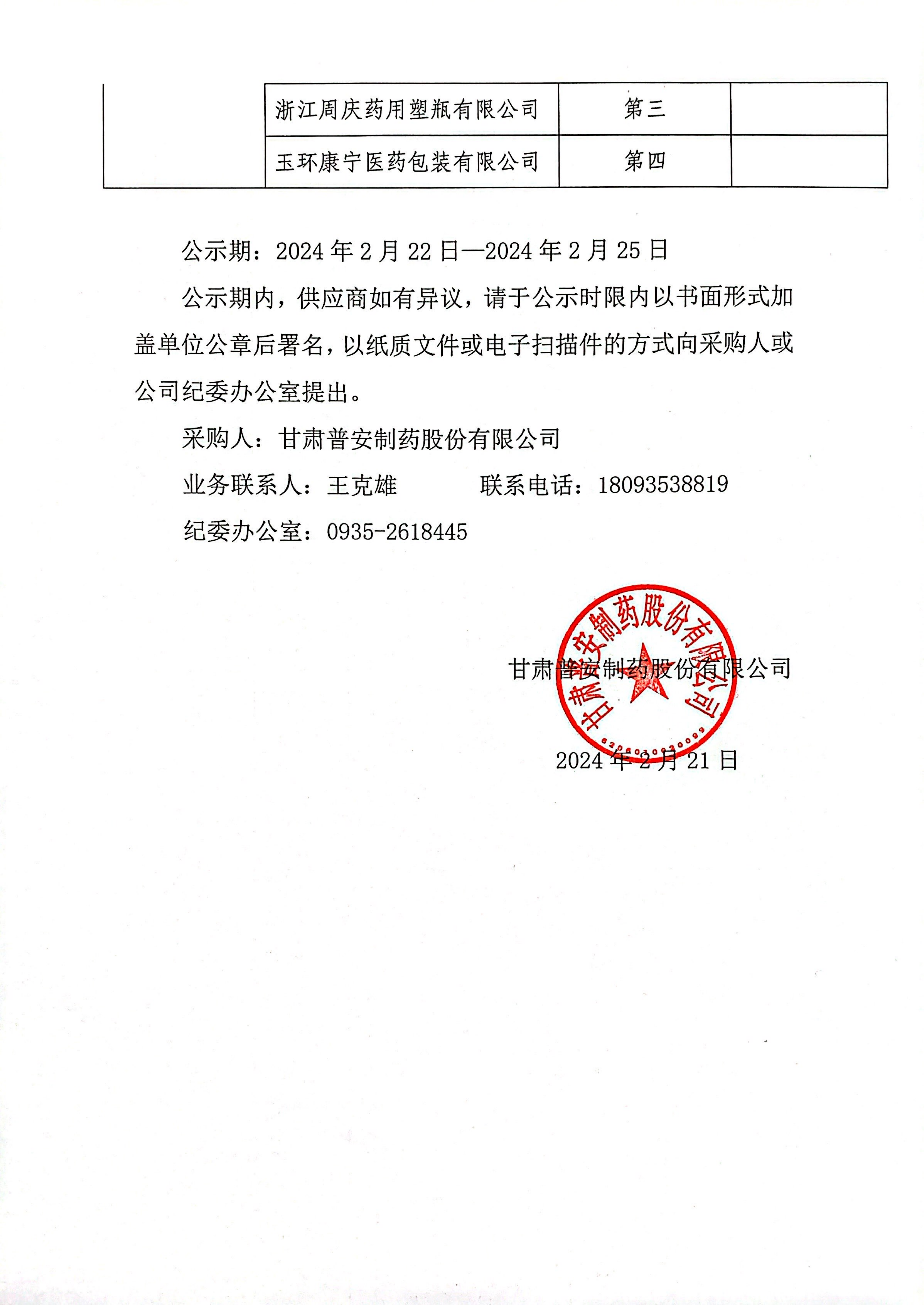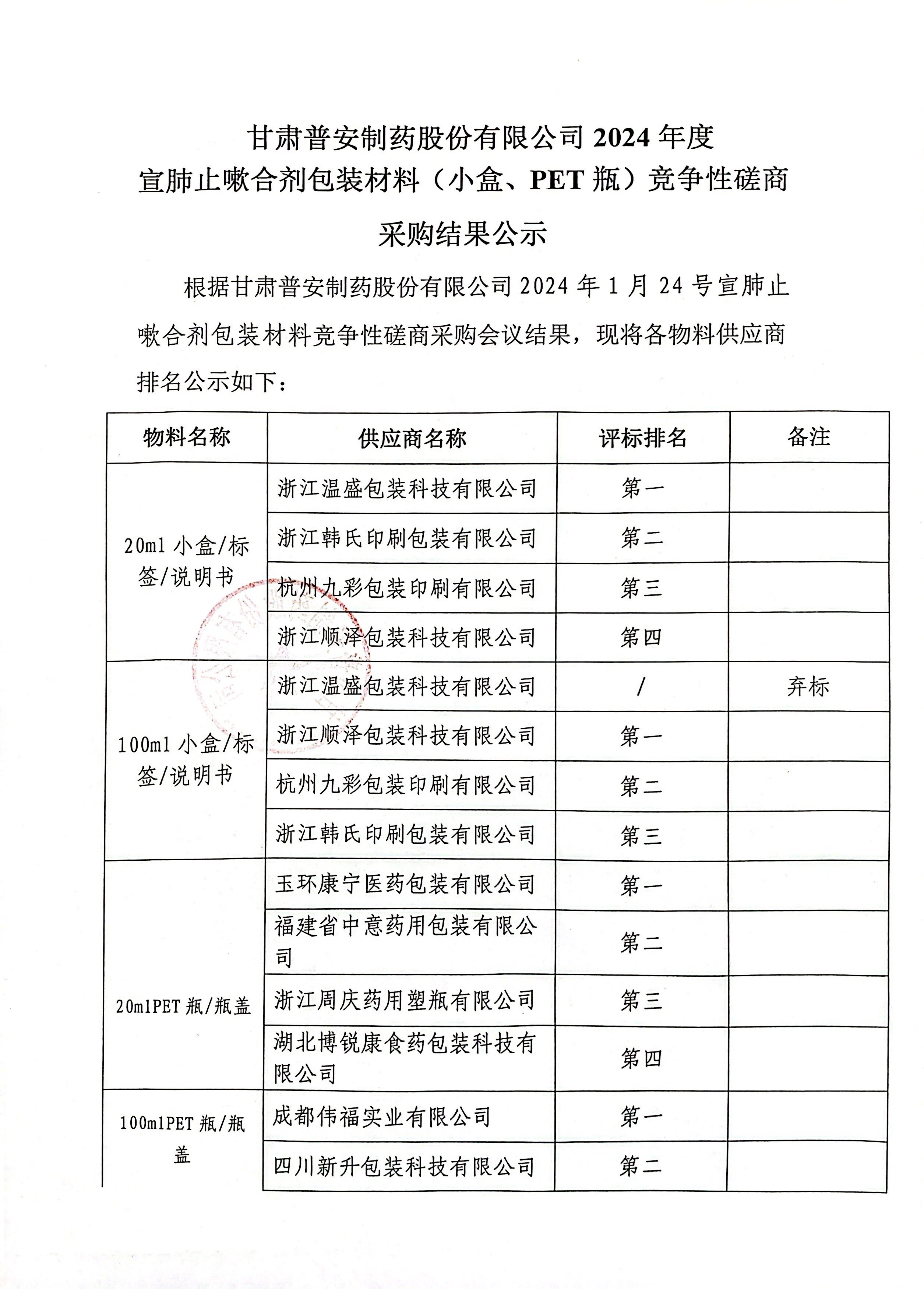 甘肅普安制藥股份有限公司2024年度宣肺止嗽合劑包裝材料(小盒、PET瓶)競(jìng)爭(zhēng)性磋商采購(gòu)結(jié)果公示