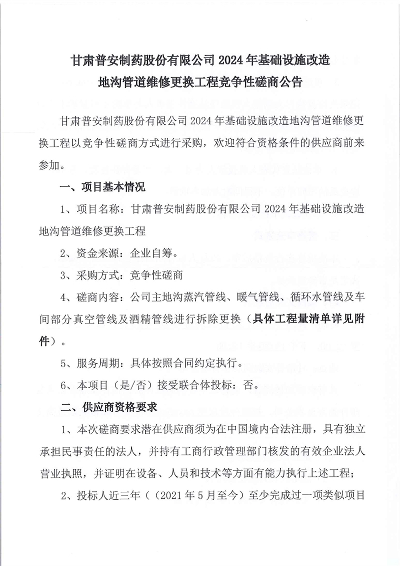 甘肅普安制藥股份有限公司2024年基礎(chǔ)設(shè)施改造地溝管道維修更換工程競(jìng)爭(zhēng)性磋商公告