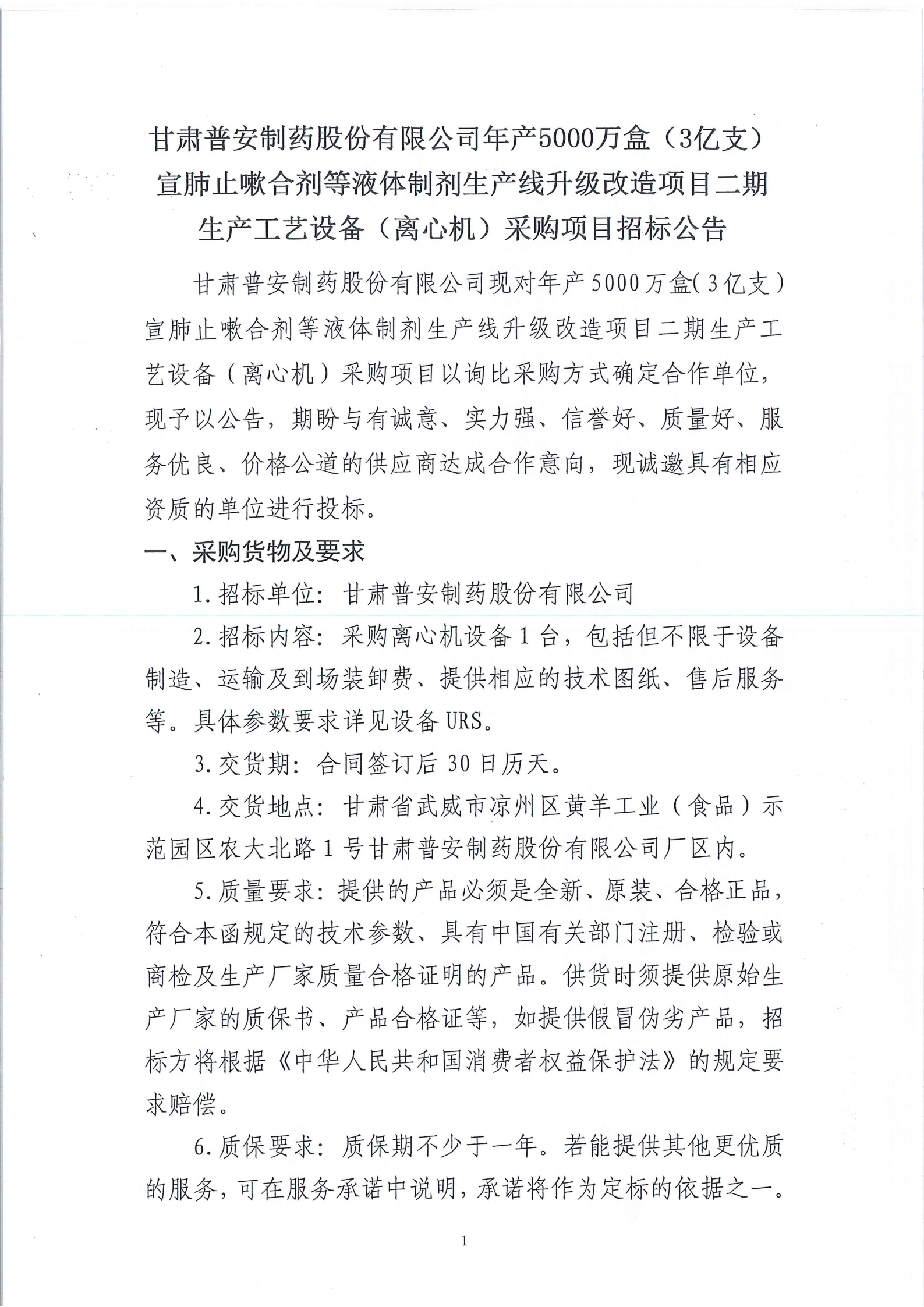 甘肅普安制藥股份有限公司年產(chǎn)5000萬盒(3億支)宣肺止嗽合劑等液體制劑生產(chǎn)線升級改造項目二期生產(chǎn)工藝設(shè)備(離心機)采購項目招標(biāo)公告