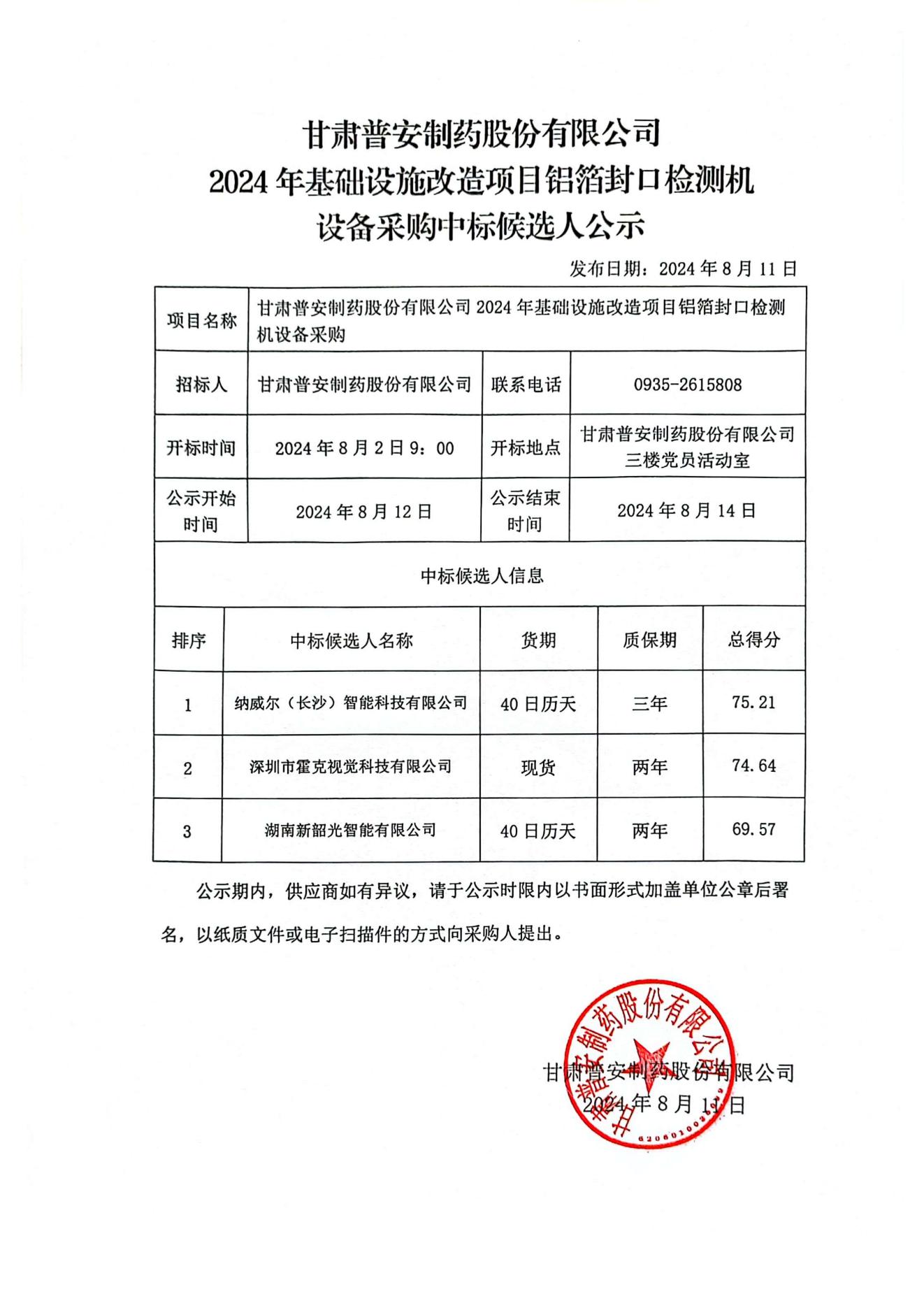 甘肅普安制藥股份有限公司2024年基礎(chǔ)設(shè)施改造項(xiàng)目鋁箔封口檢測(cè)機(jī)設(shè)備采購(gòu)中標(biāo)候選人公示