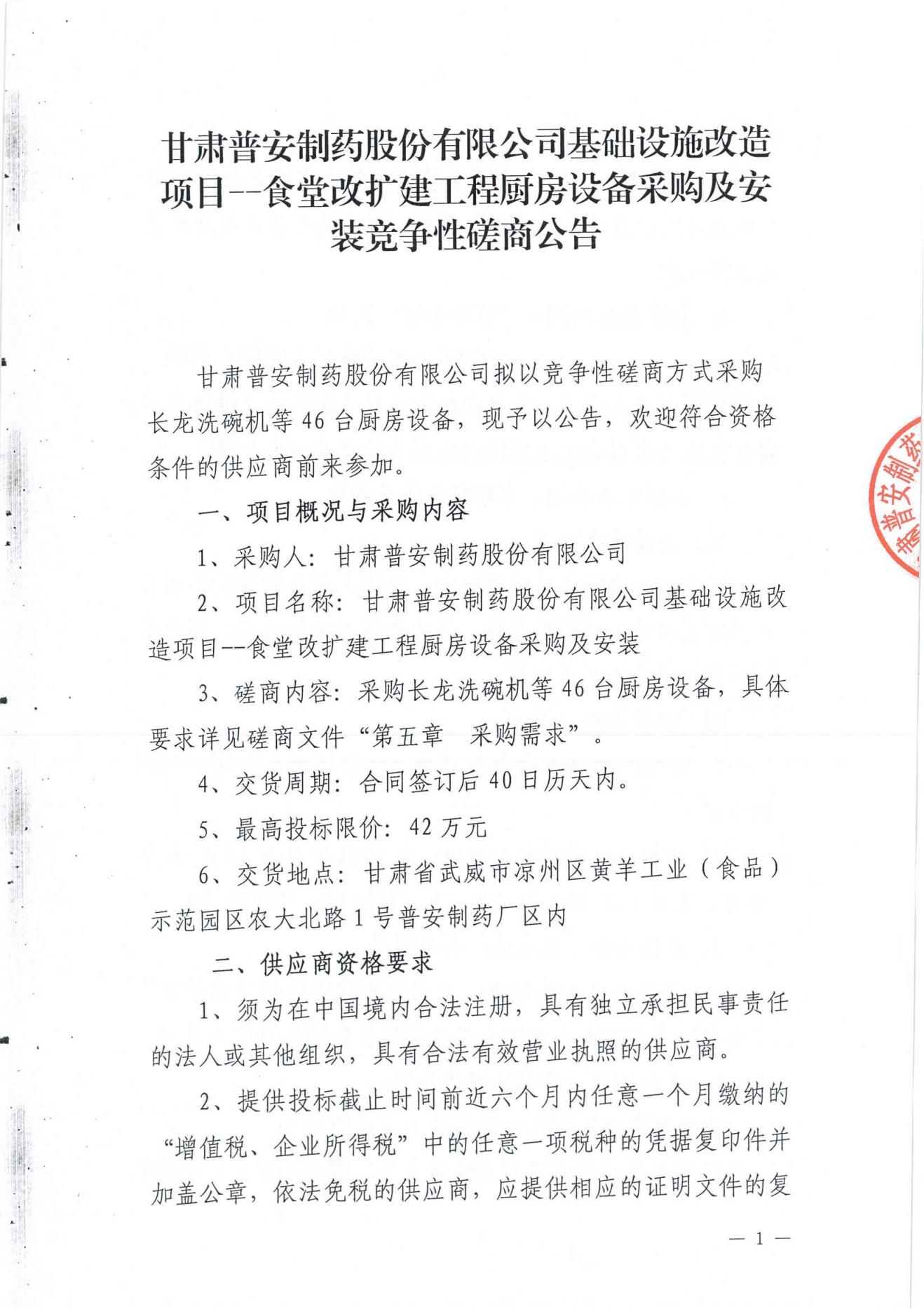 甘肅普安制藥股份有限公司基礎(chǔ)設(shè)施改造項目--食堂改擴(kuò)建工程廚房設(shè)備采購及安裝競爭性磋商公告